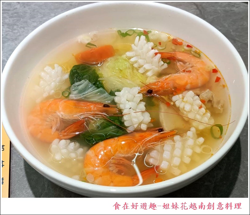 海鮮湯麵料多多,鮮蝦跟花枝舖滿整個碗面,算得上是誠意滿滿,湯頭是越南特有清爽感,吃完不油膩腸胃不負擔~