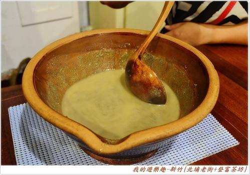 接著倒入熱呼呼的擂茶,如此便是完成品 !!
