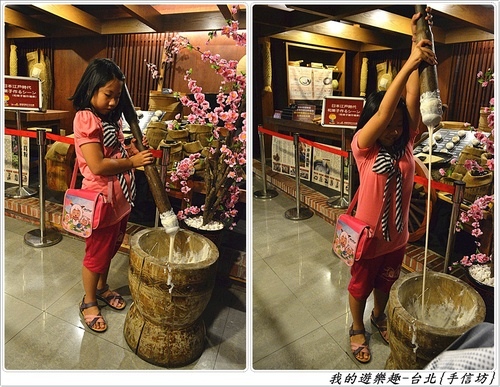 呢 ~ 在一旁的搗麻糬是可以動手體驗的,老婆先來小試身手 …..