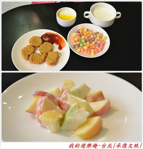 女兒先自取牛奶跟炸物及彩色球餅,另外還有芒果奶酪跟