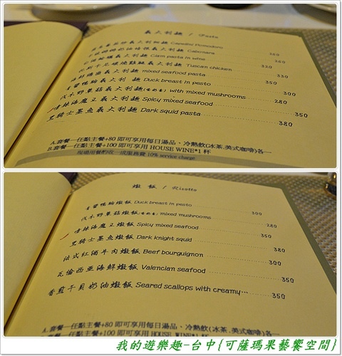 菜單分為兩種綠色的是餐食,紅色的是飲品及酒類 !!