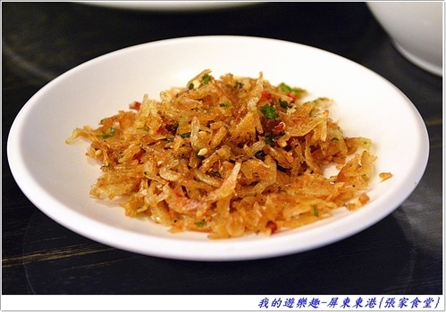 回到座位後桌上已經放置了這免費的前菜。這應該是蔥辣乾炒小蝦米吧 !!