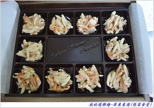 以白巧克力搭配杏仁跟櫻花蝦組合而成,每一顆的份量男生大概一口