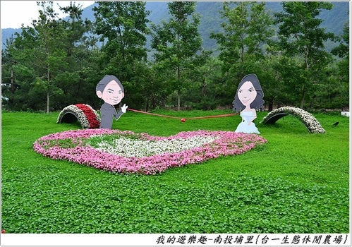 草地上的人型立牌用紅線繫住彼此,而心型花圃就是愛的象徵囉 ~