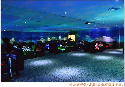 用餐環境非常寬敞,藍色的燈光搭配佈置成天空的牆面裝潢,似乎想