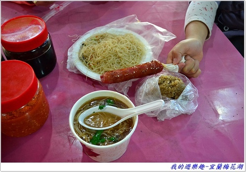 來到商店街這邊點了炒米粉、米粉羹,外加一支烤香腸跟肉粽,這樣花費不過150元上下,輕輕鬆鬆打發我們的早餐。不過除了香腸好吃外,其它的就不提了 ….. 好了,吃飽後我們就離開梅花湖繼續我們的宜蘭行程啦 ~