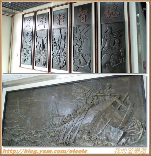 大幅的木雕作品高掛牆上,一張強調五育並重,另一張則是在