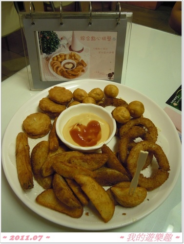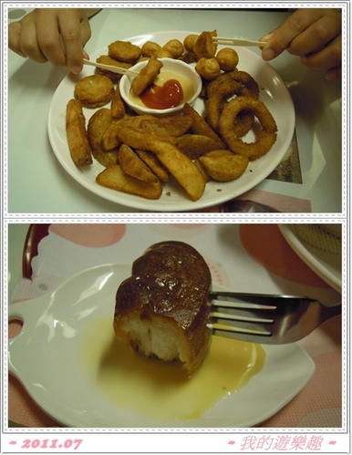 不一回兒綜合點心拼盤就送上來了,不過它讓我臉上斜線三條耶 ,