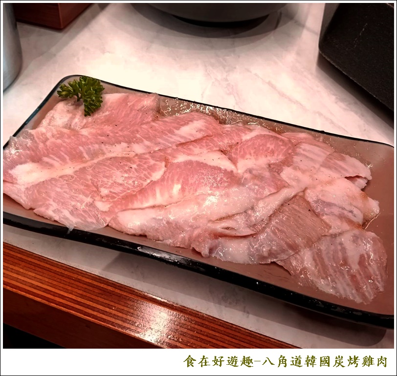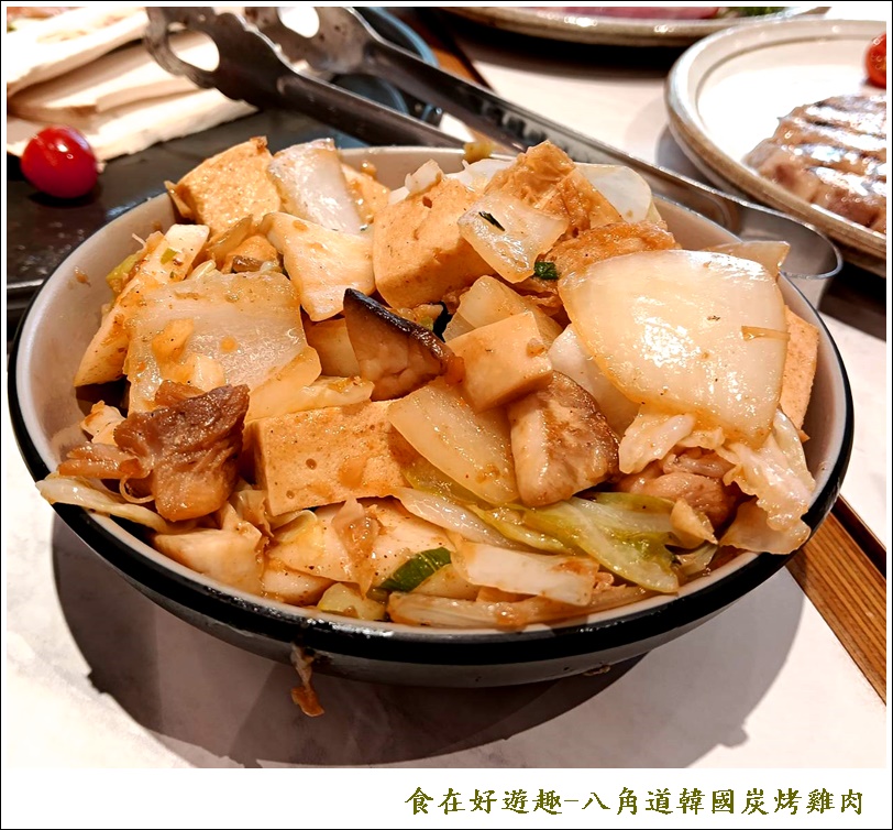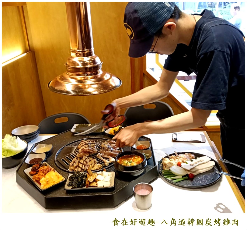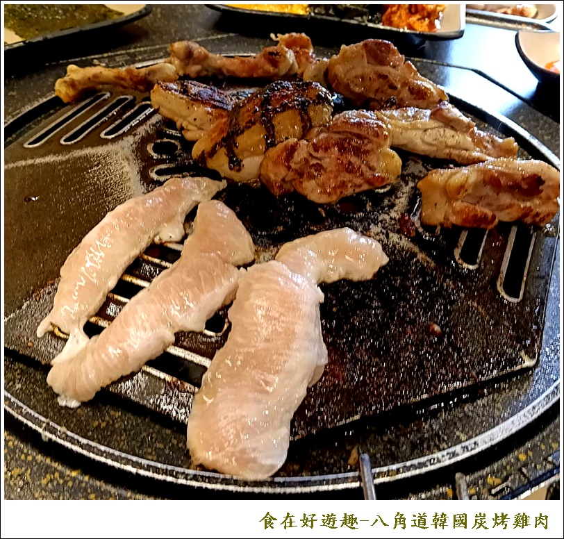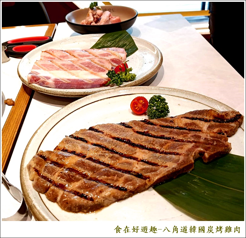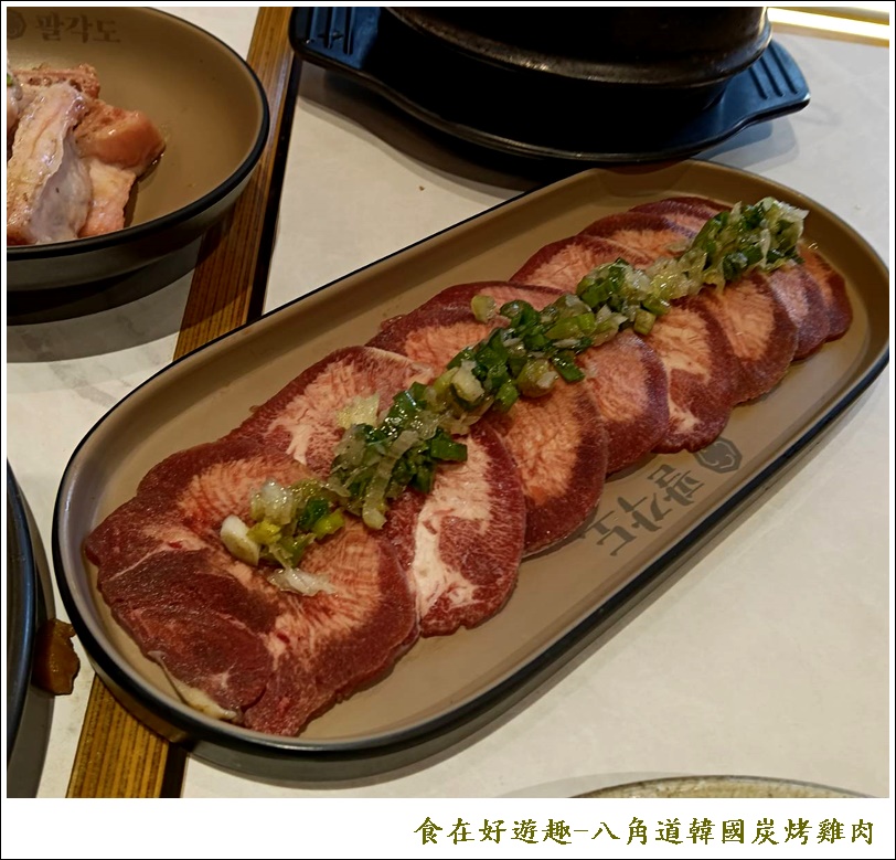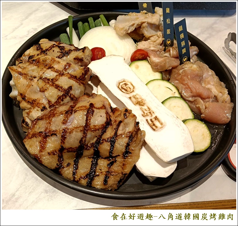這天我們點了三人豚香套餐,並加價升級韓式炸醬麵,另外還加點鹽蔥牛舌。食材上桌時,店員會先協助料理雞腿排,不得不說,炭火燒烤就是香,油脂滋滋作響更是誘人胃口,雞軟骨、雞松阪、雞横隔膜,還有帶骨翼板豬排,松阪豬、豬肋條及豬五花等等,每種肉都相當有水準,真的很好吃。附餐的牛肉大醬鍋、辣年糕及炸醬麵也同樣好滋味,但,另外單點的牛舌就比較差強人意了。