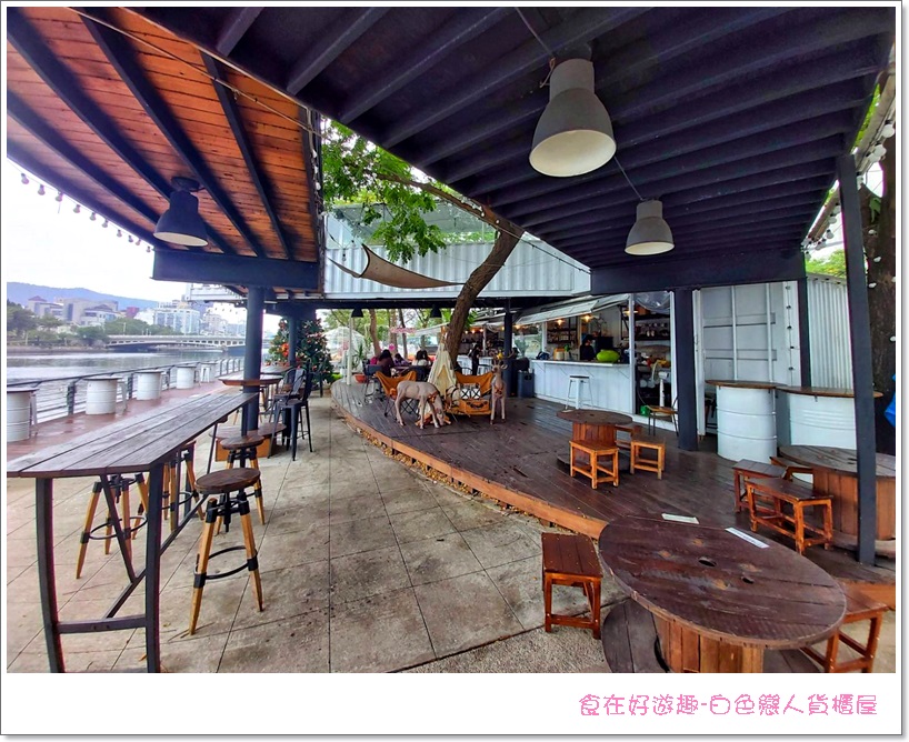 在店裡用餐低消100元起,餐點有輕食吐司、炒飯炒麵、捲餅、各式炸物點心跟甜點,飲料有果汁、手調茶飲、咖啡及各式調酒(開車不喝酒、未滿18歲也請勿飲酒),整體用餐空間採半開放式,邊享用美食邊欣賞整片河畔景緻,真的相當愜意。